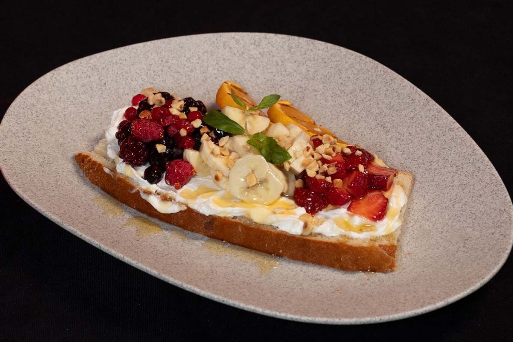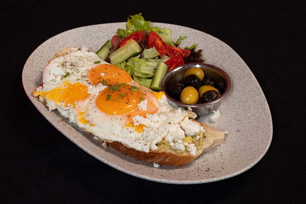 Ekşi mayalı ekmek, avakado sos, lor peynir, yumurta, frenk soğanı, cherry domates, salatalık,