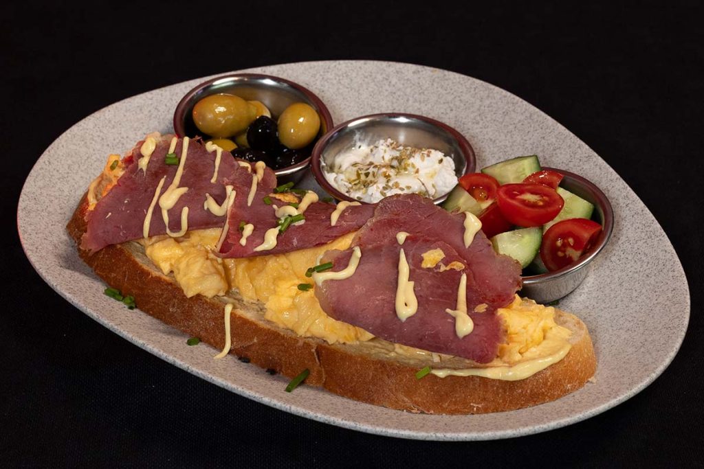 Ekşi mayalı ekmek, hardal sos, lor peynir, yumurta, füme kaburga ,cherry domates, salatalık,